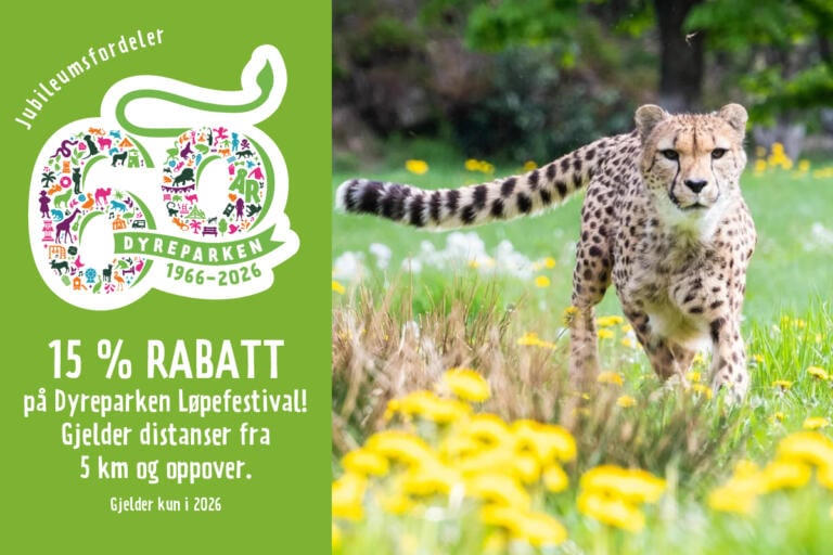 Gjelder distanser fra 5 km og oppover. Arrangeres lørdag 25. april. Rabattkode blir tilgjengelig i Dyreparkens app ved kjøp av årskort.