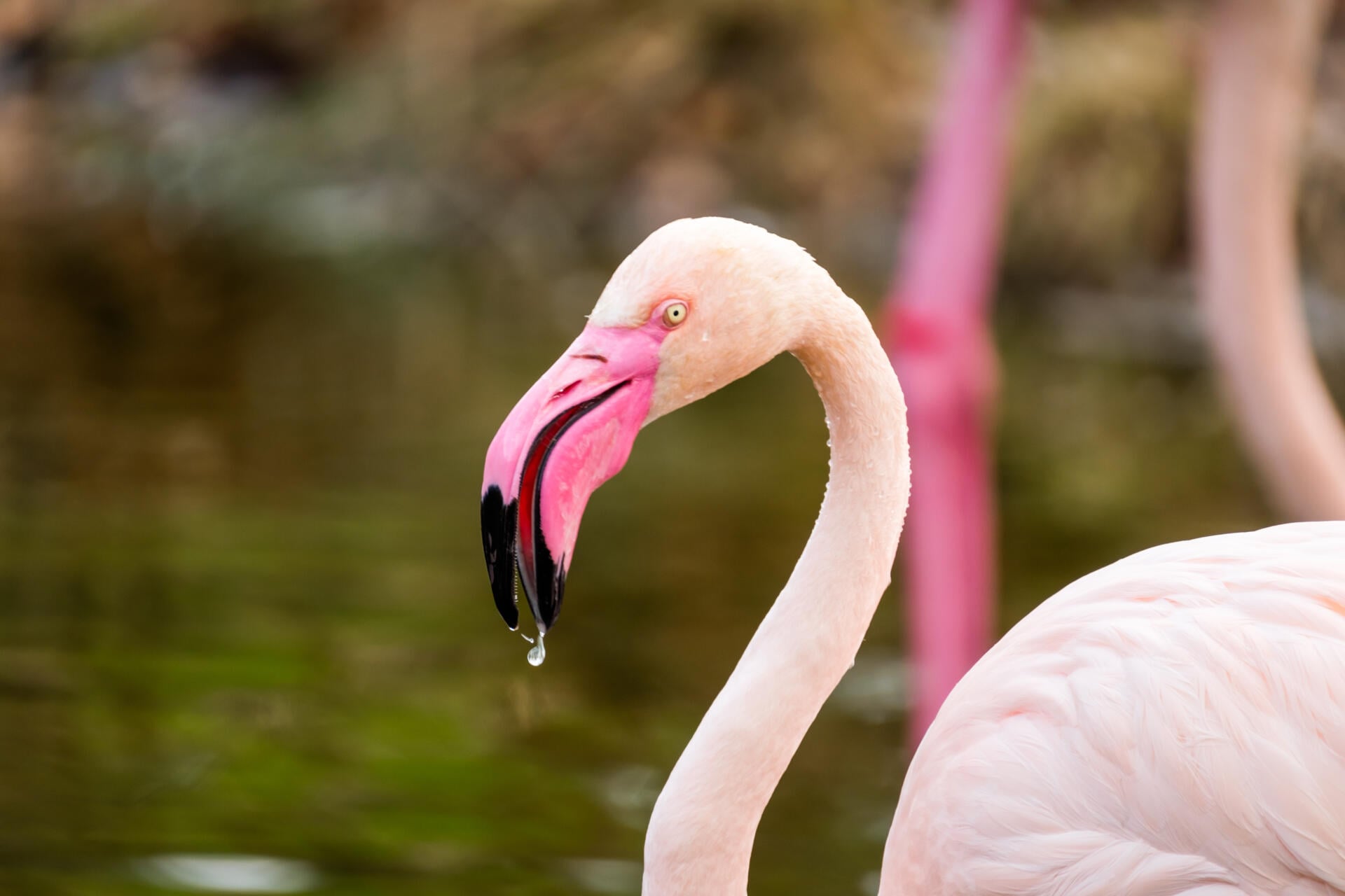 Flamingoen er ofte å finne i grunne laguner eller langs strender og elvebredder. De er gode svømmere, men foretrekker grunt vann med gjørmebunn, fordi det er der de finner mat. Flamingoen har et helt spesielt nebb som brukes til å filtrere smådyr ut av gjørmen. Ofte ser man flamingoer stå i grunt vann med nebbet, eller noen ganger også hele hodet, ned i vannet. Spesialnebbet fanger opp alle smådyrene flamingoen ønsker å spise, mens alt vannet og gjørmen som er rundt blir spyttet ut igjen.