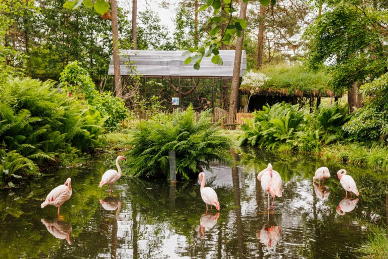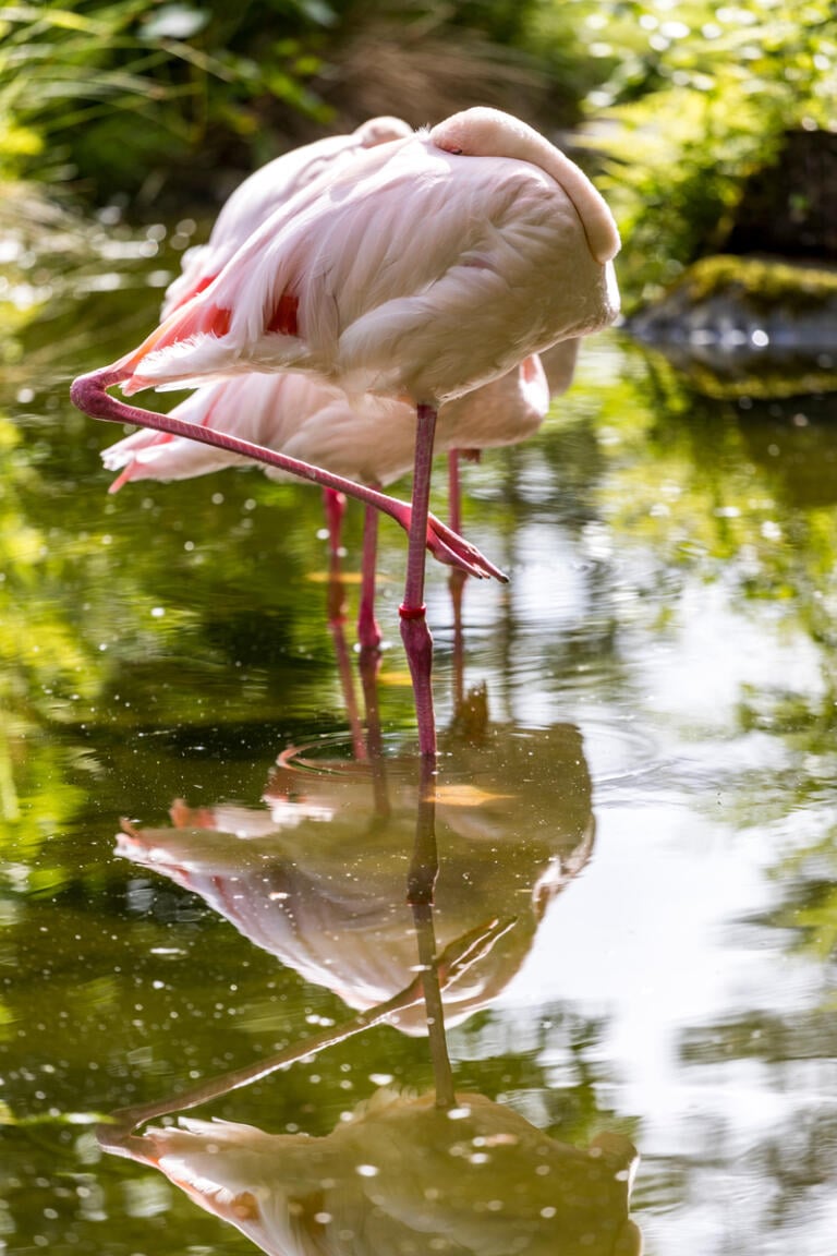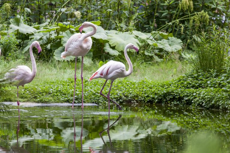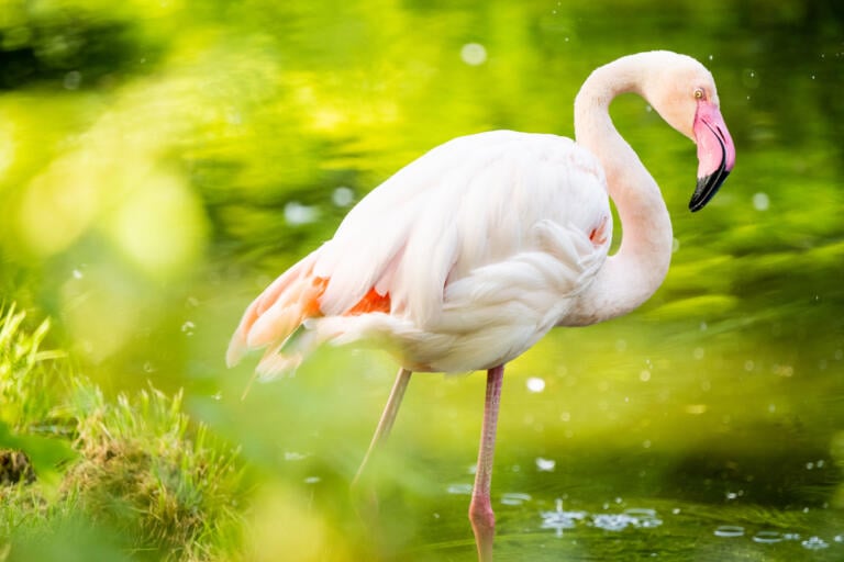 Flamingoer har lange bein og rosa fjærdrakt. Den rosa fargen får fjærene fra maten flamingoene spiser.
