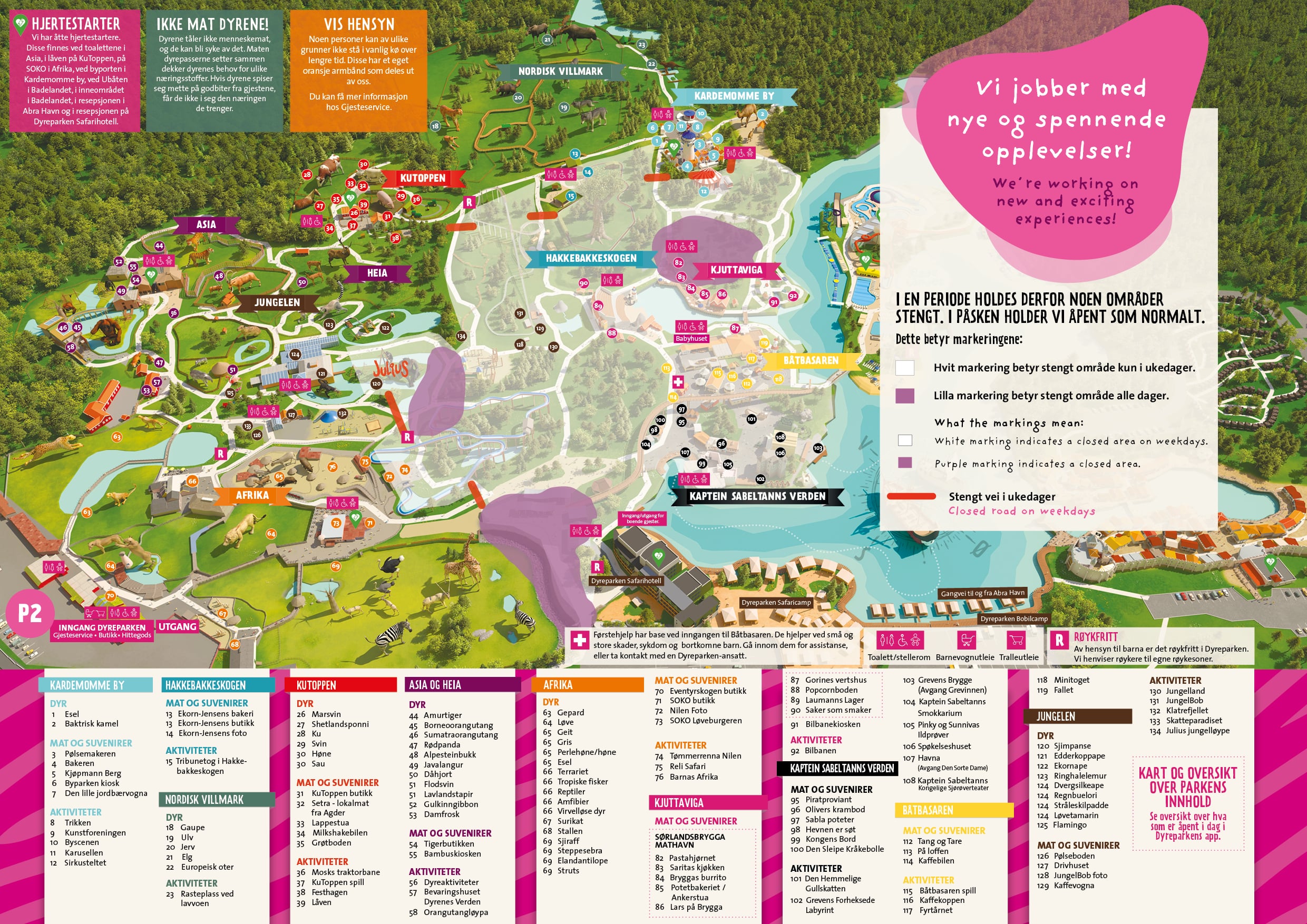I en utvalgt periode fra september – våren 2026 vil enkelte områder i Dyreparken være stengt på grunn av bygging og anleggstrafikk. Dette gjelder kun i ukedagene, og i helger og ferier holder områdene åpne som normalt. Se dette kartet for hvilke områder som er stengt i ukedagene.