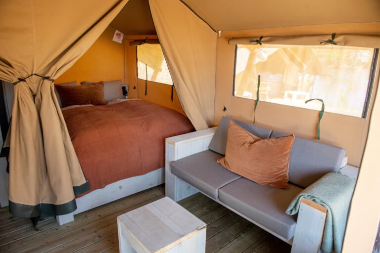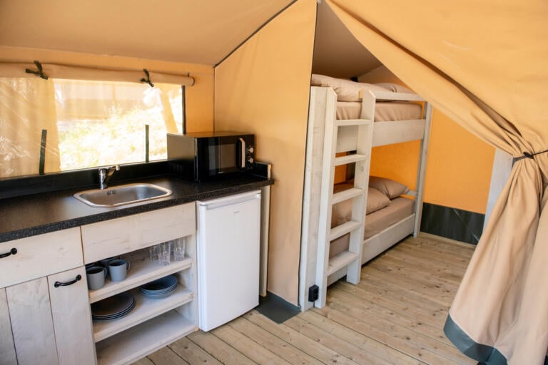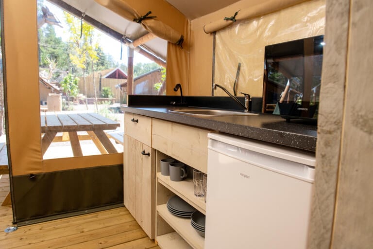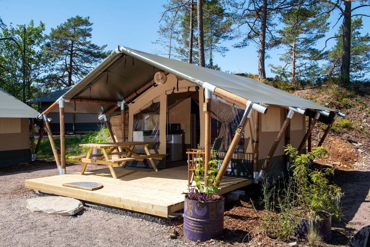 Fire-sengers safaritelt (25 kvm.), komplett innredet med to soverom, minikjøkken og stor terrasse.