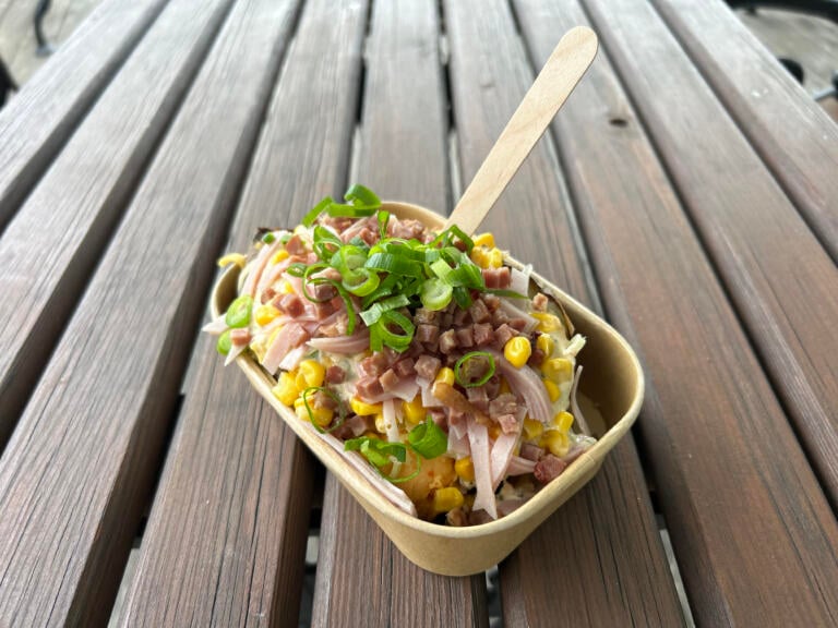 Med ost, mais, vårløk, skinke og rancher dressing