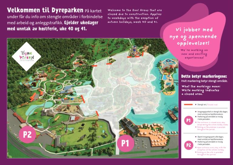 I samme periode vil enkelte områder i Dyreparken være stengt på grunn av bygging og anleggstrafikk. Dette gjelder KUN i ukedagene. Se markering på bildet for ukedager og i helgene vil områdene være åpent som normalt.