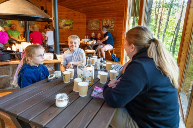 Velkommen til bords i Villmarkshytta! Her serveres en varmende viltgryte med hjort, hjemmelaget lapskaus til barna, og en smakfull vegetarisk gartnergryte som alternativ. Til dessert får du en deilig panna cotta, og som drikke tilbyr vi lokalprodusert, frisk eplejuice.