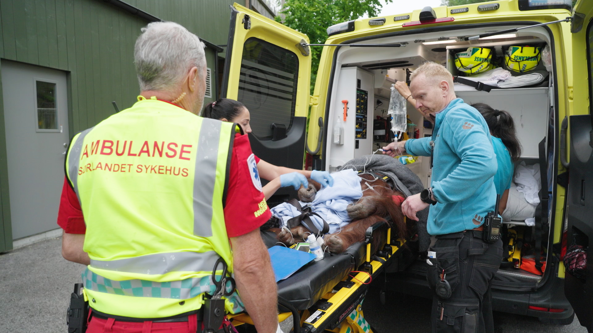Den snart 40 år gamle orangutangen ble transportert i ambulanse av prehospitale tjenester og tatt hånd om av ansatte på Sørlandet sykehus som alle arbeidet frivillig og på fritiden sin.