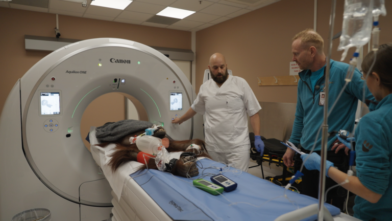 Det er ikke uvanlig for orangutanger å få kroniske problemer med halsposen og respirasjonssystemet, både orangutanger i naturen så vel som i dyreparker. Nå er hele overkroppen til den 60 kilo tunge hunnen scannet, og Dyreparken venter på svar fra undersøkelsen.