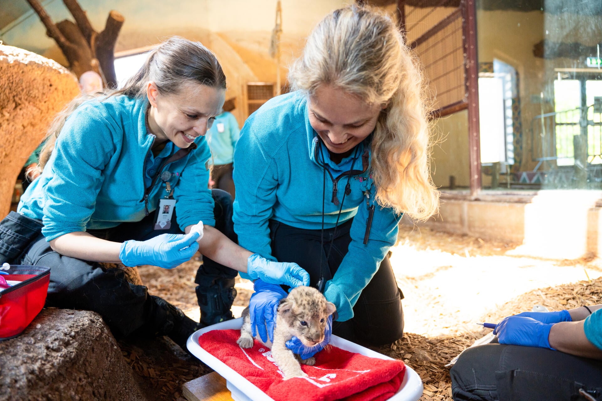 – Vi har sjekket kjønn, satt inn ID-chip, veiet dem og sjekket at alt står bra til. Det gjør det. Det er fem friske løveunger,
